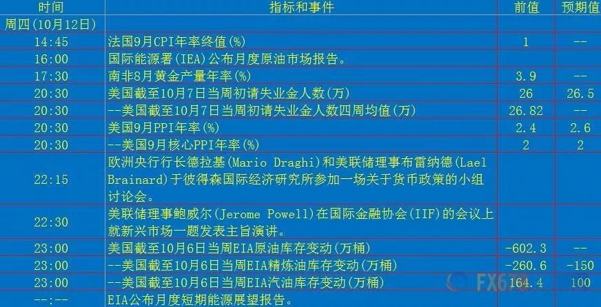 周四(10月12日)关键词:美国EIA原油库存及月报、鲍威尔