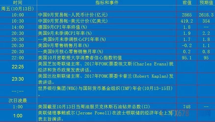 周五(10月13日)关键词:中国贸易帐、美国CPI、美国零售销售