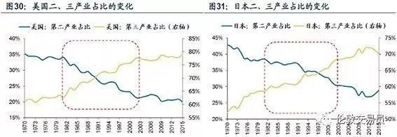 进入80年代,美国、日本的工业化进程减速,第二产业占比开始快速下降、第三产业的占比明显上升,见下图。