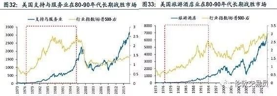 在服务业快速崛起时期(上图),美国和日本的支持与服务业、旅游酒店、文娱、传媒教育等行业指数均长期跑赢市场(下图)。