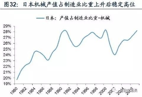 通用及电气机械占日本制造业产值的比重自80年的19%持续上升至90年代的28%,并维持在高位 (图32)。