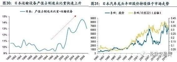 从90年代后期,日本汽车出口量及出口额均常年保持在10%以上的增速,运输设备产业占制造业的比重快速上升 (图30),进一步巩固了日本汽车行业在国民经济的支柱性地位,其股价也长期跑赢大市 (图31)。
