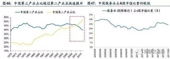目前中国正在经历服务业快速崛起的进程,第三产业占比已超过第二产业且快速提升(图46),这恰巧对应着美日两国80-90年代服务业提速发展、股价随之映射的时期。