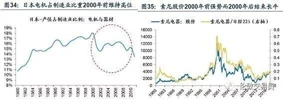 不过,日本电器板块在全球市场中受到了来自韩国、中国等后起之秀的竞争压迫,在2000年后增速放缓、占制造业的比重开始下降 (图34),同时在股市中也结束了持续13年的长牛态势 (图35)。