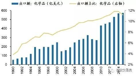 1973年,韩国提出《重化工业计划》扶持石化产业。80年代起,在“出口导向” 政策下,重化学工业逐渐由进口替代发展为出口主导部门,年出口额持续攀升,目前占出口额比重超过10% (下图)。