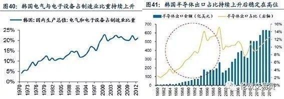 韩国在70年代、80年代先后确立了“重化学工业”和“科技立国”战略,从劳动密集型向资本、技术密集型转型,在全球分工中形成以电子、化工为代表的优势产业。