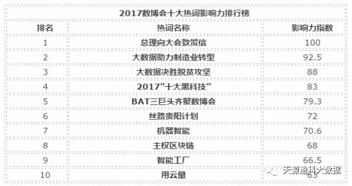 6月1日,贵阳市委宣传部与新华社中国经济信息社联合发布《2017中国国际大数据产业博览会十大热词影响力排行榜》。2017数博会的十大热词依次为:总理向大会致贺信、大数据助力制造业转型、大数据决胜脱贫攻坚、2017“十大黑科技”、BAT三巨头齐聚数博会、丝路贵阳计划、机器智能、主权区块链、智能工厂、用云量。