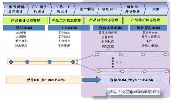 目前,全生命周期的BOM管理已经是企业数据中心管理的核心,数据采集的主线也围绕BOM的演变过程进行。在企业实际的产品制造业务规划过程中,分为EBOM、PBOM、MBOM、中性BOM、实物BOM和维护BOM,如下图所示。其中以前三个阶段的BOM管理更深入,产品全生命周期的管理能力最根本的也就是体现在BOM的管理能力上。