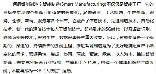 德国工业4.0涵盖了很多技术,如自动化、机器人、系统集成、工业物联网、边缘计算、雾计算、云计算以及工业安全,还包括大数据分析、增材制造、仿真技术、增强现实技术等等。图5来自美国密西根大学金炯华教授的分享,可以看出美国人理解的智能制造也包括了智能的产品、智能的装备、智能的生产、智能的管理和智能的服务。智能制造是工业4.0的一个核心,企业应具有极具竞争力的产品,高度柔性化的工厂和运营,同时应带给社会可持续化的影响。