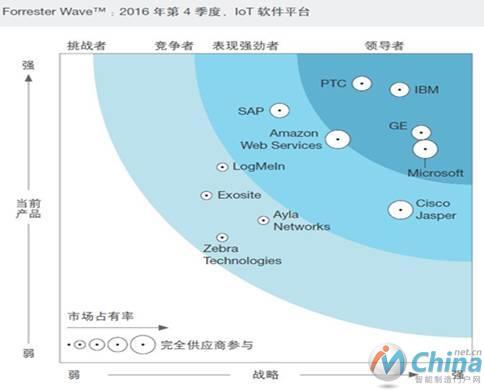 工业物联网是智能制造十分重要的支撑技术,也是企业非常关注的焦点。工业物联网领导者象限里有PTC、IBM、GE、Microsoft,Amazon作为云服务商介于领导者和表现强劲者之间,SAP和Cisco等公司则是表现强劲者。据统计,中国的物联网平台已超过150个。