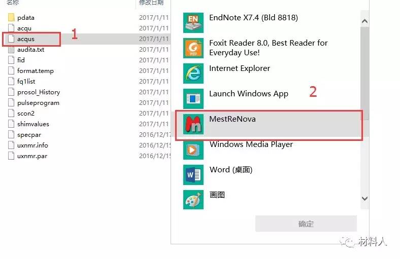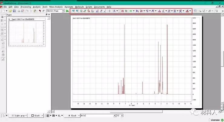 要分析核磁图,首先要先会打开它(以小编做的一个材料为例,溶剂为CDCl3)。打开文件夹,选择任意一个文件(以acqus为例)后选择用MestReNova打开。我们最常用的就是下图中红色框内的几个按钮了。