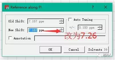 用红框中的键对溶剂峰定标(选择7.26附近的峰,将ppm值改为7.26)