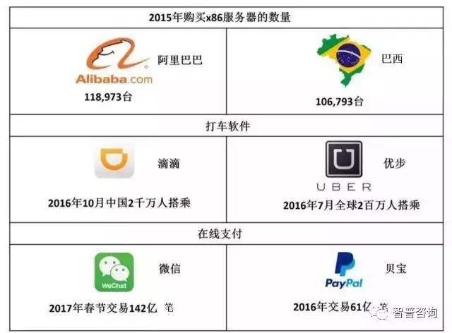 2015年阿里巴巴购买的服务器数量,超过了巴西整个国家;而微信在2017年一个春节期间的交易笔数,就超过美国PayPal一年的数量。