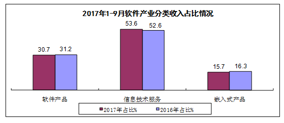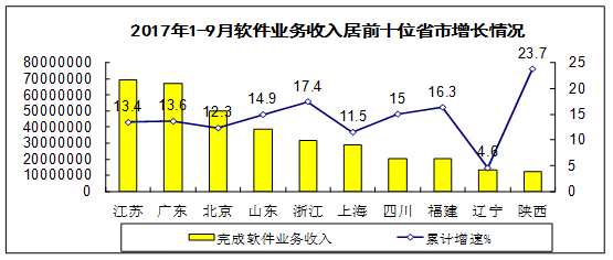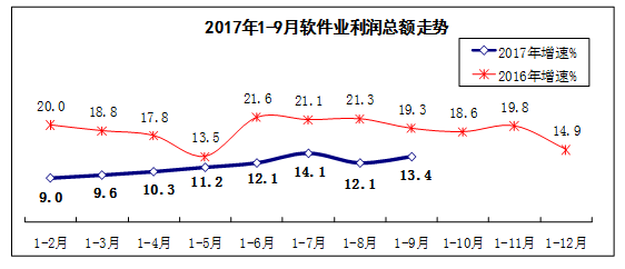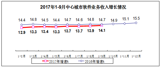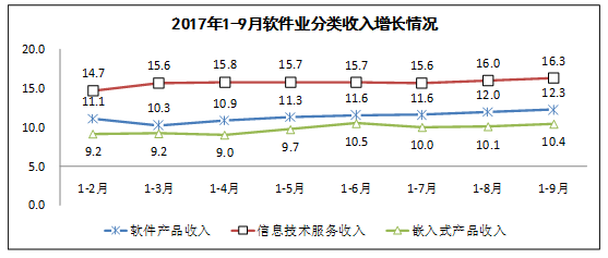 软件业务收入稳步增长,三季度增速有所提高。前三季度,我国软件和信息技术服务业完成软件业务收入39827亿元,同比增长14.1%,增速同比回落0.6个百分点,比上半年提高0.5个百分点。其中9月份增长16.3%,增速比7、8月分别提高3.6和0.7个百分点。
