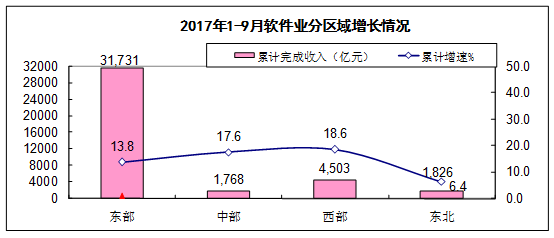 三季度各地区增速均有所提升,中、西部地区增速保持领先。前三季度,东部地区完成软件业务收入31731亿元,占全国软件业务收入79.7%,同比增长13.8%,增速同比回落1.1个百分点,比上半年提高0.5个百分点;中部地区完成软件业务收入1768亿元,占全国软件业务收入的4.4%,增长17.6%,增速同比回落0.7个百分点,比上半年提高1.1个百分点;西部地区完成软件业务收入4503亿元,占全国软件业务收入的11.3%,增长18.6%,增速同比提高1.7个百分点,比上半年提高0.9个百分点;东北三省完成软件业务收入1826亿元,占全国软件业务收入的4.6%,增长6.4%,增速同比提高0.2个百分点,比上半年提高0.7个百分点。