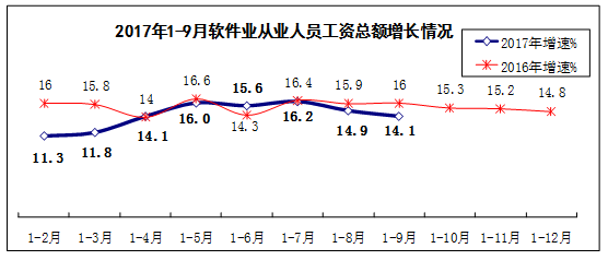 从业人数平稳增加,工资水平保持较快增长。前三季度,我国软件和信息技术服务业从业平均人数603万人,同比增长3.7%,增速同比回落2.3个百分点,比上半年回落1.9个百分点。从业人员工资总额增长14.1%,增速同比回落1.9个百分点,比上半年回落1.5个百分点;人均工资增长10%,同比提高0.6个百分点。