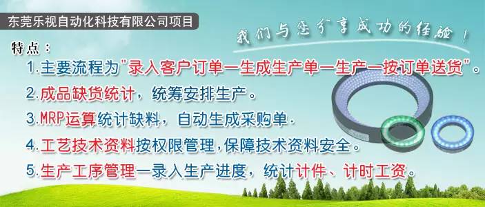 东莞乐视自动化科技有限公司是专业的机器视觉LED光源的制造商,客户遍布全国,订单非常多。如何跟踪每张订单每个产品的生产和送货情况就显得特别重要。同时由于订单众多,材料的采购统计也是很困难,如何能保障每张订单的材料采购及时,足料生产也是东莞乐视关心的地方。 《信华ERP生产管理软件》从以下几点切实帮助东莞乐视解决管理的难题: ①软件的主要流程为:“录入客户订单——生成生产单——生产——按订单送货”,一张客户订单可录入多项产品,经过订单审批后,可自动每个产品生成一张生产单,然后各生产单分别领料生产,生产完成后成品入库,再按客户订单进行送货。 ②软件有专门的“成品缺货统计”功能。可根据产成品的未完成订单数量、实有库存数量、在产数量计算产成品的缺货数量。方便根据市场订单情况适当安排产品的生产。同时在录入客户订单也能提供产品可用数量以作参考。 ③软件有“缺料表自动生成功能”,可综合未完成订单需求数量、在途库存、委外库存、在产库存、实有库存和最低库存数量等数据进行MRP运算,求出多张生产订单综合起来材料的缺料数量。缺料表自动生成功能可把缺料情况导出到excel,也可以自动生成采购单,能大大提高PMC和采购的工作效率,并能切实保障每张生产订单都能足料生产。 ④每项产品都可以把相应的工艺技术文件保存到系统里,而且可有相应权限来控制是否能下载相应的工艺技术文档,保障技术保密。 ⑤软件设有“产品工序设置”工能。可用来设置每一个成品所需生产工序及各工序的加工单价。当生产订单录入时,如果所选择的产品设有相应的产品工序,软件将会自动带出。通过生产进度录入,各工序的完成情况会回写到生产单中,查询生产单时就可以清楚了解各工序的生产完成情况,软件并可自动统计汇总各员工的计件工资。 |