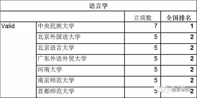 根据公示名单显示,2017年国家社会科学基金年度项目共有3196项目进行公示,其中重点项目344项,一般项目2852项。2017年国家社会科学基金青年项目共有1097项,西部项目共有492项目。据数说司法公众号(justice_data)统计,语言学立项高校排名如表1。