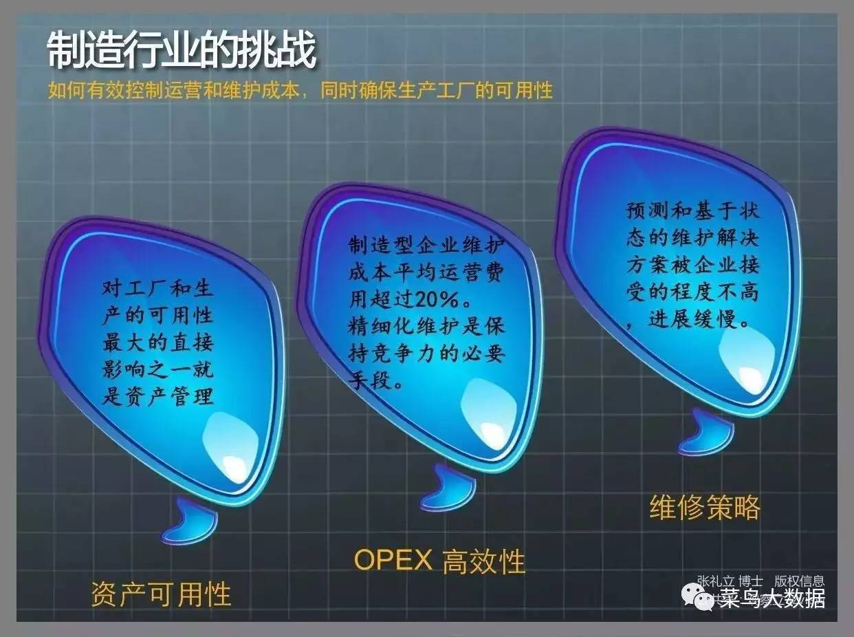 张礼立:“设备智能管理是智能制造数据的核心来源,通过工业物联网平台连接了所有人、物与事,然后利用大数据工具来分析已知事件、预测问题、挖掘新知识、协助管理决策等。通过下面这套PPT,我们一起探讨三架马车。”