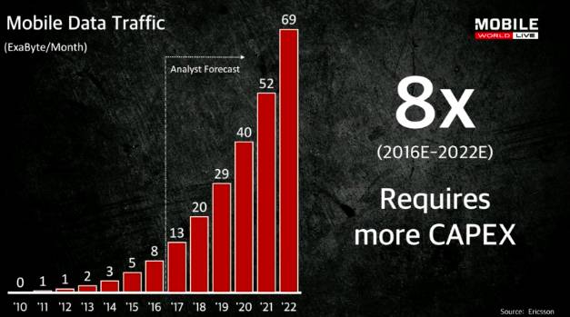 尽管ARPU在下降,智能手机接近饱和,但是,数据流量需求却在急剧上升,这意味着运营商的资本开支(CAPEX)将上升。