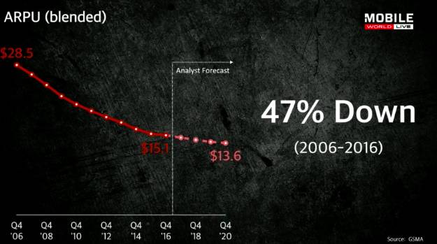 过去10年,运营商的ARPU下降了47%,不过据分析预测,未来几年还将继续下降。