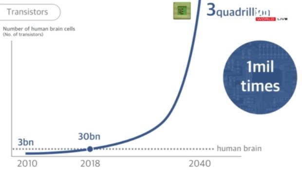 芯片里有晶体管,也同样是按照这种方式工作的。我们的人脑里有多少“二进制系统”?人脑有300亿个神经元。那么,芯片里的晶体管数量什么时候会超过300亿?在20年前,我估计这事会发生在2018年,几年前我又重新估计了一下,结果依然是2018年。