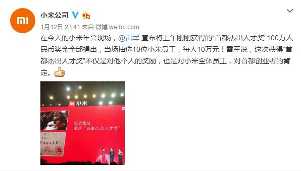 「 雷军捐出百万个人奖金 发10万现金大红包 」