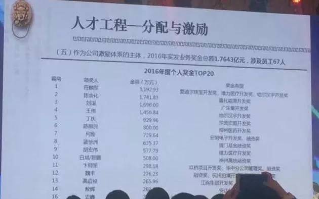 其中,奖金3000万元以上的一人,1000万-2000万元之间的有3人,500万元以上的有6人。