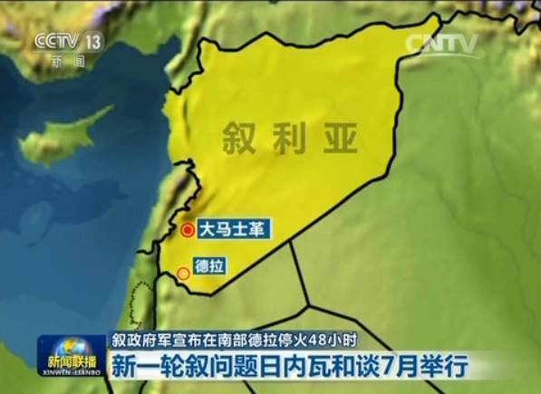 叙政府军宣布在南部德拉停火48小时叙利亚军方17日发表声明说,在南部城市德拉停战48小时。同一天,联合国和俄罗斯分别宣布,希望7月份举行新一轮叙利亚问题日内瓦和谈与阿斯塔纳和谈。