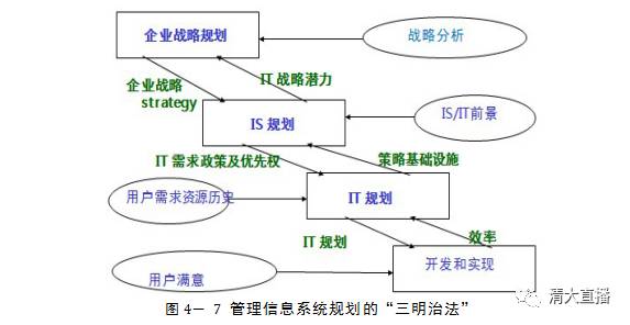 管理信息系统规划,应基于企业变革,结合企业战略规划。最能说明企业战略规划和信息系统(information systym,IS)规划、信息技术(information technology,IT)规划关系的是“三明治法”,如图4-7所示: