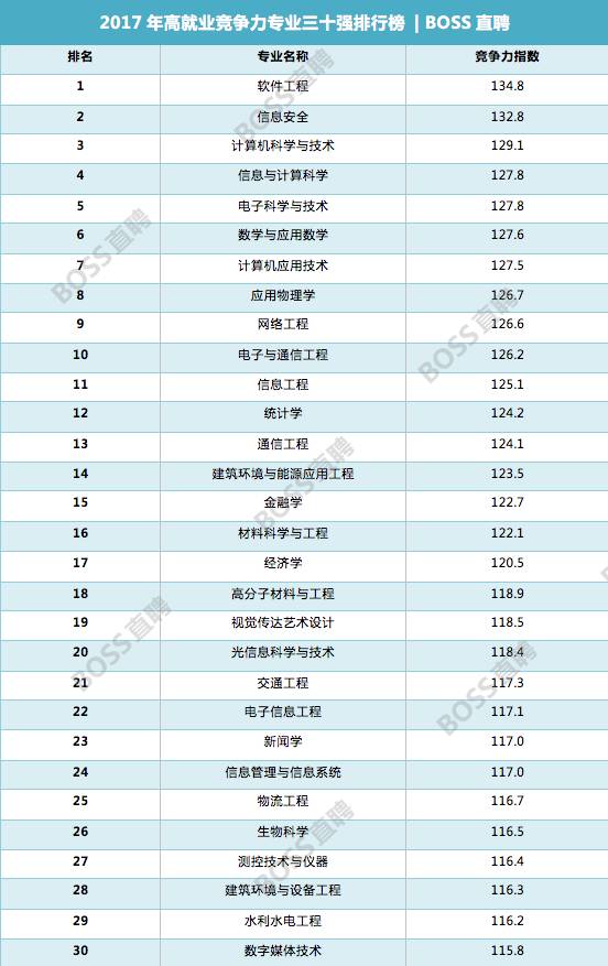 2017年高考正式结束,选择合适的专业和学校成为今年940万考生眼下最重要紧急的任务。那么2017年什么专业最有钱途?且看BOSS直聘近日发布的《2017年专业就业竞争力榜单》。