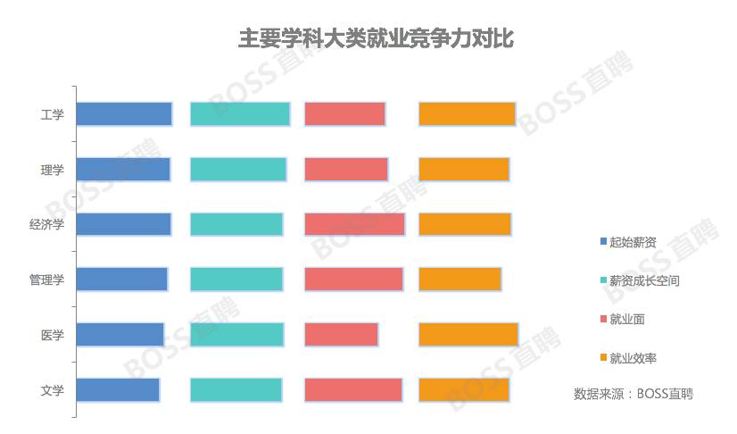 而从学科整体来看,更偏实际应用的工学是目前就业竞争力最高的学科。理学、经济学、医学分列二至四名,彼此之间差距不大。文学、管理学尽管在综合竞争力上不及上述学科,但在某些特定方面具备明显优势,例如在就业面上,文学类专业比工学类的就业宽度高出40%以上。