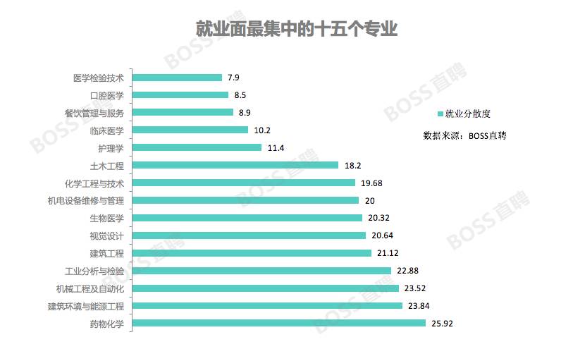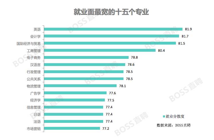 高薪资、高就业率往往就是人们心中的好专业,不过一个专业的就业面同样不容忽视。有些专业的应届生虽然在毕业起始阶段不占优,但由于工作选择面较广,他们有更大几率通过转行,选择自己喜欢的工作来改变职场轨迹。BOSS直聘通过不同专业学生在各个职位的分布比例,计算出每个学科的就业分散度,数字越高代表学生毕业后可从事的工作越为广泛。