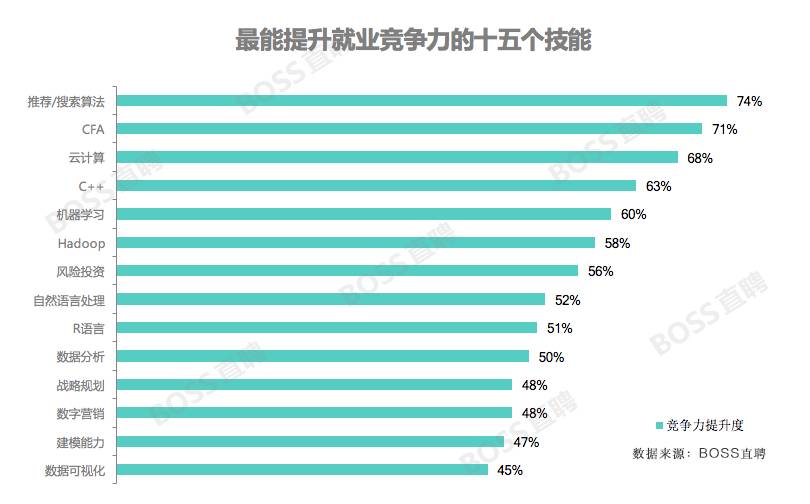 通过对2017年应届生的简历和求职互动行为进行解析,BOSS直聘量化了各种技能对提高就业竞争力所带来的帮助。