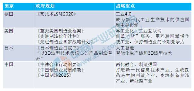美国自2008年金融危机起遇到了产业空心化,鉴于在其GDP总量中服务业占比70%而制造业仅占12%的不平衡结构,美国提出“先进制造业伙伴计划”,旨在振兴“美国制造”;日本制造业产值占GDP 比重达20%,日本已从国家层面上开始高度重视科技附加值高的高端制造业;德国以精益制造领先全球,提出“工业4.0”企图再次引领新一轮工业革命,巩固其竞争地位;中国经济增长放缓,经济结构调整站在了制造业转型升级的十字路口。未来制造业将回归各国战略重心,成为全球经济稳定增长的重要引擎。