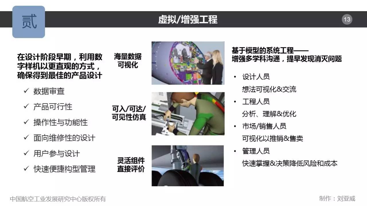 虚拟/增强工程在设计阶段早期,利用数字样机将海量数据可视化,以更直观的方式,提升对复杂系统的理解,实施诸如可入/可达/可见性仿真和活动组件的直接评价,确保得到最佳的产品设计。还可包括:数据审查,产品可行性研究,操作性与功能性分析,面向维修性的设计,用户参与的设计,快速便捷的构型管理等。虚拟/增强工程对于基于模型的系统工程(MBSE)的意义是,它增强了多学科的沟通,提早发现和消灭问题。对于设计人员,支撑想法的可视化与交流;对于工程人员,支撑对问题的分析、理解与优化;对于市场/销售人员,支撑可视化以向用户推销和售卖;对于管理人员,支撑对风险和成本的快速掌握和降低决策。