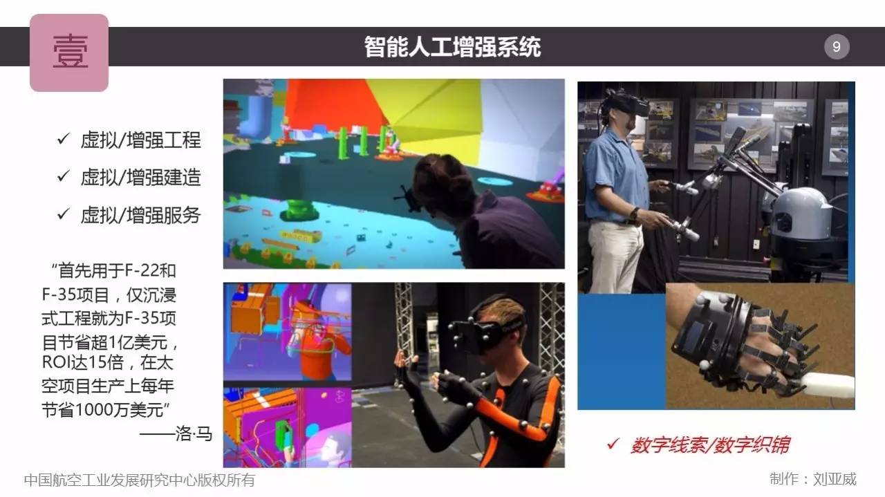 全球正在经历智能制造转型,提升人的感知、分析、决策、执行能力成为航空工业的重中之重。基于VR/AR的智能人工增强系统由数字线索支撑,提升对复杂系统和过程的理解和洞察,充分发挥人类智慧创新,确保任务高效无误执行。通过虚拟现实技术,能够得到更好、更贴近用户需求的设计,更合理、更精益的生产工艺规划,更省时、更便捷的人工培训,更高效、更高质量的人工操作,极高的投资回报率和极低的错误率。人是智能制造系统的有机组成部分和智能制造转型之路的核心资产,VR/AR技术也将是未来航空制造业提质增效的一个必然选择,作为核心技术支撑航空智能制造转型。