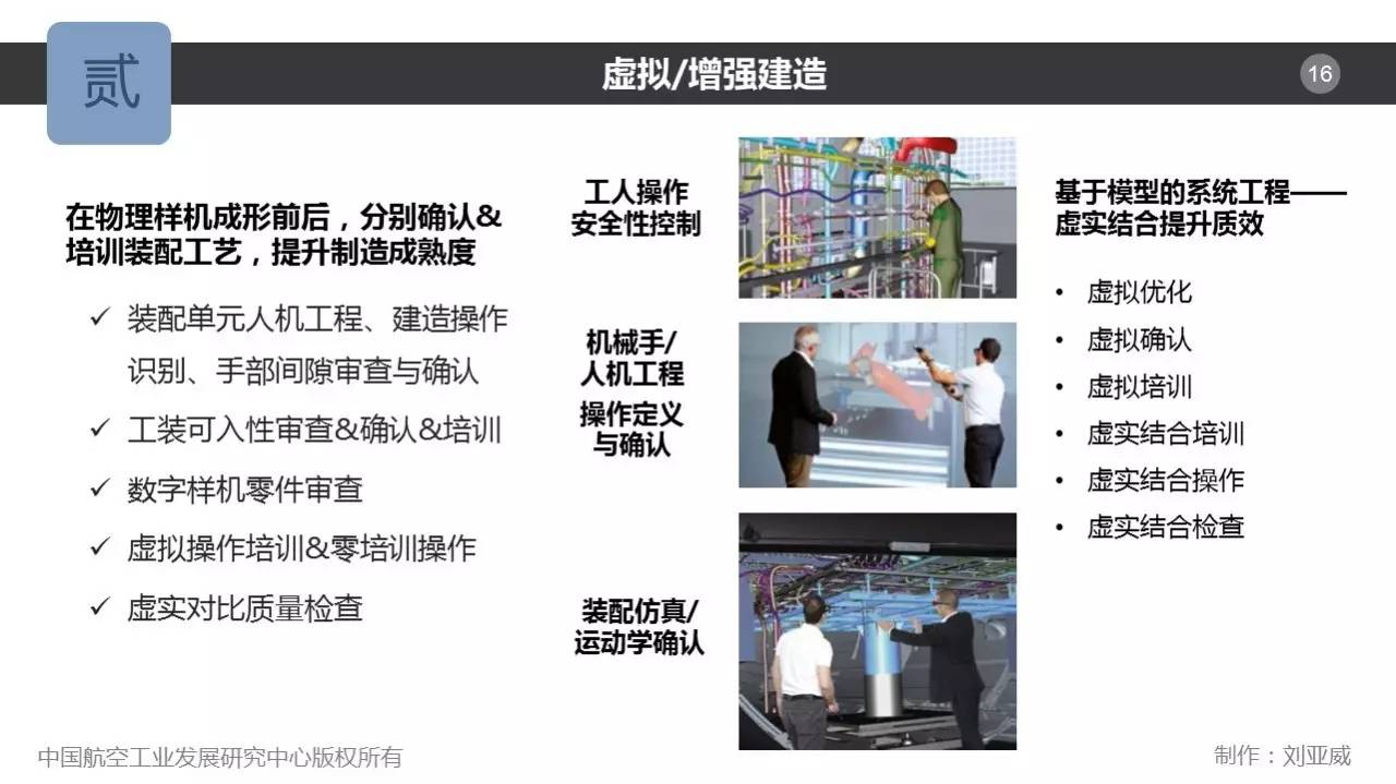 虚拟/增强建造在物理样机成形前后,分别确认和培训装配工艺,包括工人操作安全性控制、机械手/人机工程操作定义与确认、装配仿真/运动学确认等,提升制造成熟度。还可包括:装配单元人机工程、建造操作识别、手部间隙审查与确认,工装可入性审查、确认与培训,数字样机零件审查,虚拟操作培训与零培训操作,虚实对比质量检查等。虚拟/增强建造对于MBSE的意义是,通过虚实结合,即虚拟优化、确认和培训以及虚实结合的培训、操作和检查,提升生产制造的质效。