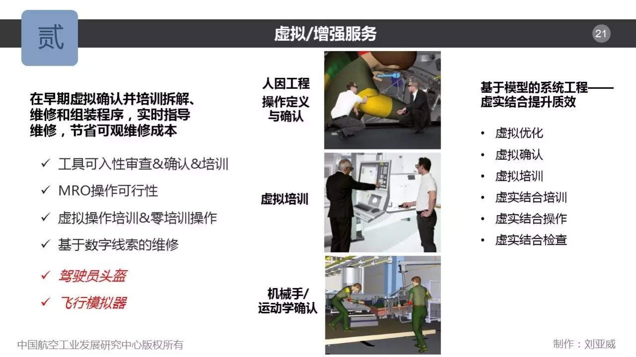 虚拟/增强服务在早期虚拟确认并培训拆解、维修和组装程序,实时指导维修,节省可观的维修成本。还可包括:工具可入性审查、确认与培训,维修、修理与大修(MRO)操作可行性分析,虚拟操作培训与零培训操作,以及基于数字线索的维修等。由于过程类似,虚拟/增强服务对于MBSE的意义也是一样的,即虚实结合提升质效。