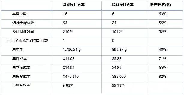 表1是另一个经典案例,美国Munro公司为某整车企业设计的电池托盘,通过利用精益设计方法,从设计端大幅降低产品复杂程度,使得各项生产相关指标大幅度提升。