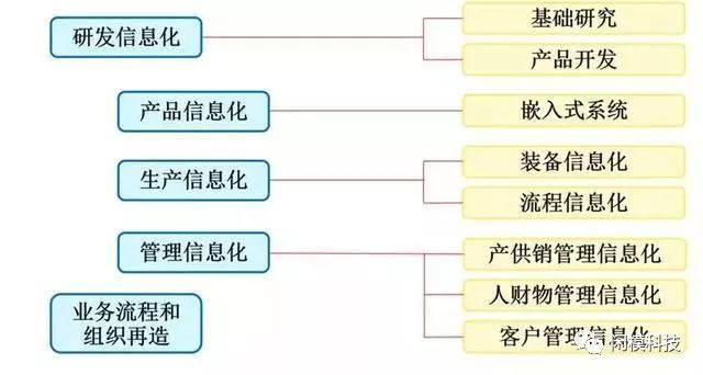 制造业信息化的发展,主要是围绕着企业的业务运行而展开。首先是企业内部信息化,见图1。这包括“四化一再造”,也就是研发信息化、产品信息化、生产信息化、管理信息化以及业务流程和组织再造。其中产品信息化,主要是指带有嵌入式系统的产品,其复杂程度各不相同。理解产品信息化,对理解当下的智能制造,非常重要。