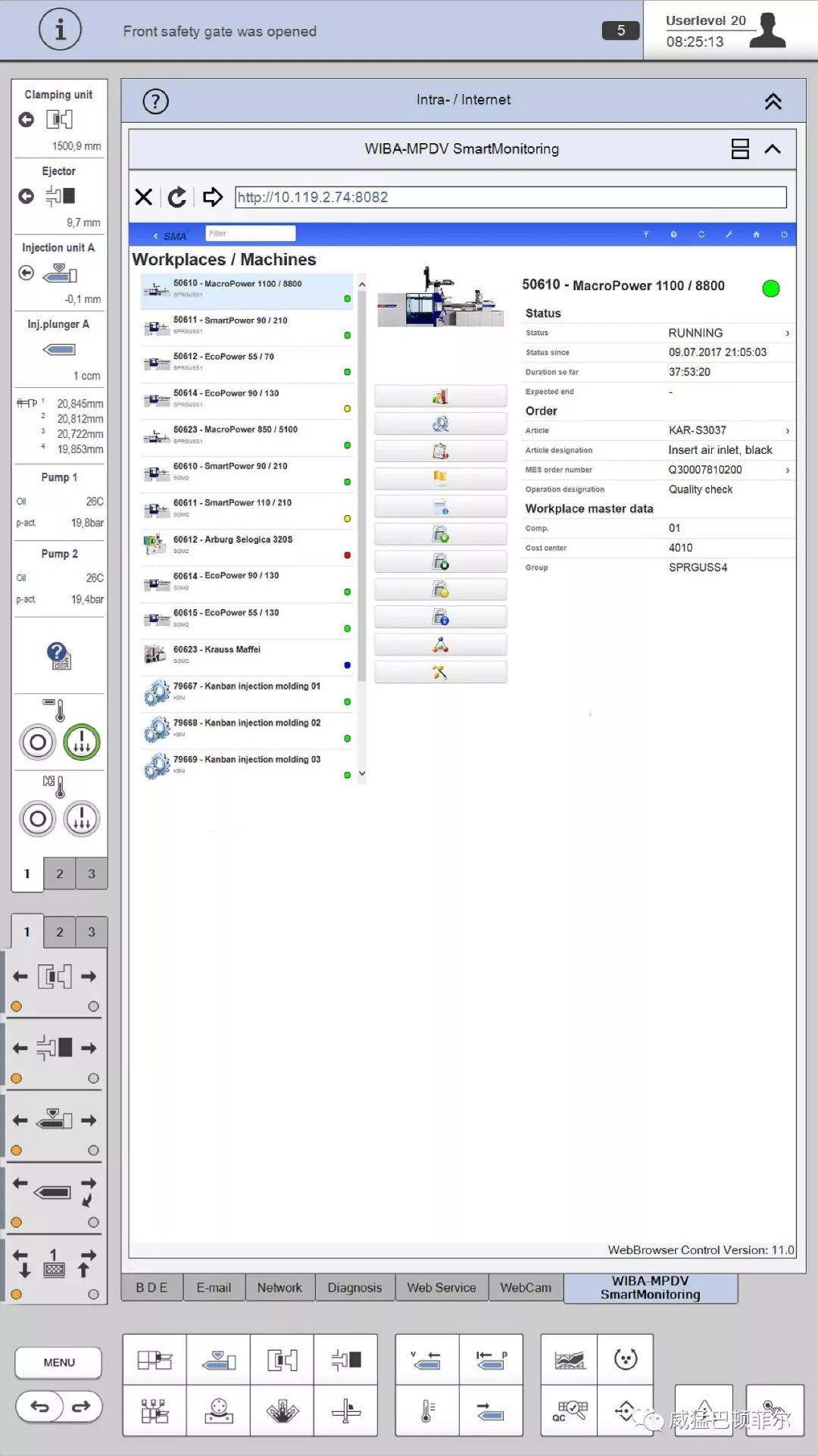 对于用户来说,威猛巴顿菲尔注塑机通过与MPDV公司开发的MES HYDRA结合,可为用户带来一个特有的优势:那就是来自MES的各种状态信号都可以在威猛巴顿菲尔机器的每个UNILOG B8显示屏上显示。这样,您就可以通过每个UNILOG B8显示屏全面地查看MES系统所连接的所有机器的大体状况。根据您所安装的设备软件包,您可以在UNILOG B8控制显示屏上近乎直接地实现生产监测、OEE评估或维护管理等功能。