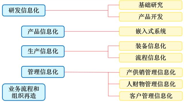 制造业信息化的发展,主要是围绕着企业的业务运行而展开。首先是企业内部信息化,见图1。这包括“四化一再造”,也就是研发信息化、产品信息化、生产信息化、管理信息化以及业务流程和组织再造。其中产品信息化,主要是指带有嵌入式系统的产品,其复杂程度各不相同。理解产品信息化,对理解当下的智能制造,非常重要。