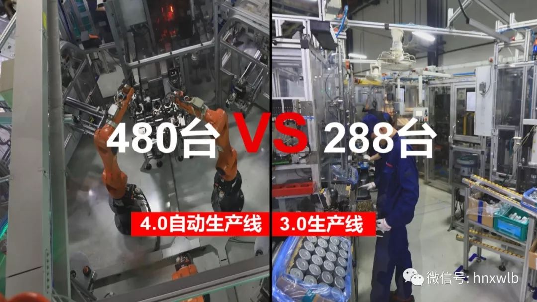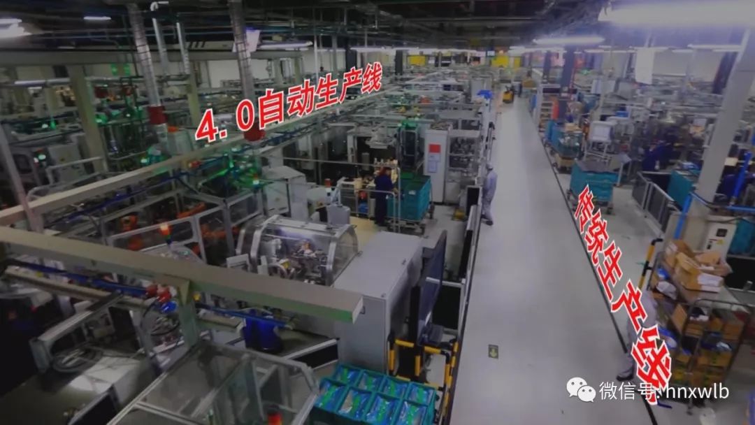 在博世长沙公司,以这条过道为界,画面右边是传统流水线,12个工人, 12.5秒生产一台刹车防抱死马达;画面左边是全新的博世工业4.0自动生产线,2个工人、5台机器人, 7.5秒下线一台马达。两条线的产品一模一样,但一个小时之内,一边是288台,一边是480台。