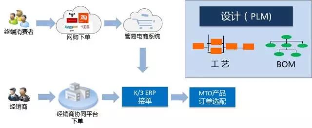 应用价值:终端消费者通过管易电商系统下单,经销商通过经销商协同平台下单,传递到K/3 ERP。K/3 ERP接单后,通过MTO产品订单选配,在已有零部件的基础上进行变型设计、制造和装配,最终向客户提供定制产品。