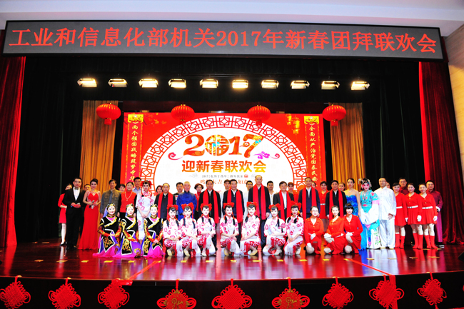 2017年1月24日,工业和信息化部举办了2017年新春团拜联欢会。部党组书记、部长苗圩,部党组成员、中央纪委驻部纪检组组长郭开朗,部党组成员、副部长陈肇雄、徐乐江、刘利华、辛国斌,部党组成员、国家烟草专卖局局长凌成兴,部党组成员、总工程师张峰,老部领导李毅中、王旭东、朱高峰,部机关全体干部,在京直属单位主要负责同志约600余人参加团拜联欢会。团拜联欢会由部直属机关党委常务副书记楼宇光主持。
