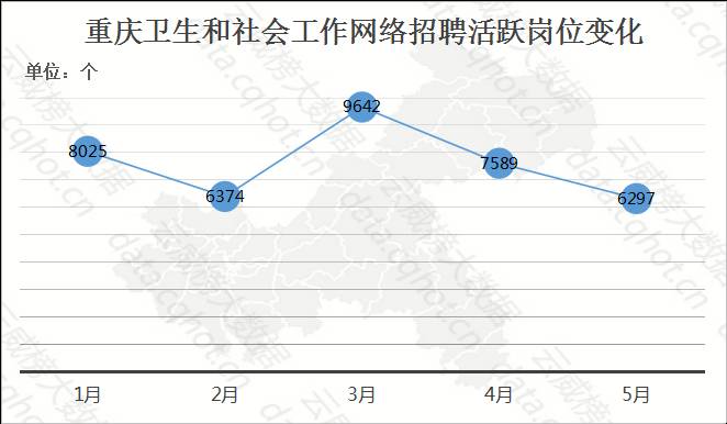 5月,重庆卫生和社会工作行业网络活跃岗位数为6297个,环比下降17.02%。
