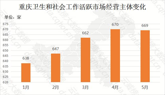 1-5月,重庆卫生和社会工作行业活跃市场经营主体保持平稳增长,主要集中在渝中区、江北区和沙坪坝区。
