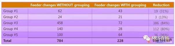 图6为欧洲某EMS工厂部署实施的Valor自动排产系统的应用案例,该工厂有三个分厂,一共有15条生产线,这是其中某分厂的自动优化排产后得到5个产品组群。通过对比可以发现,在没有进行智能组群的情况下供料器的换线时间及成本损失。