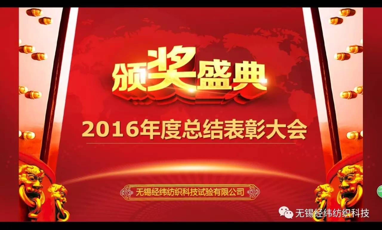 “回首2016,我们团结一心、顽强拼搏,取得了卓越的成绩!”,“展望2017,我们将开拓创新、与时俱进,以新的姿态、新的步伐,谱写新的篇章!”2017年1月24日中午无锡经纬纺织科技试验有限公司“2016年度总结表彰大会”在倒计时中拉开序幕。